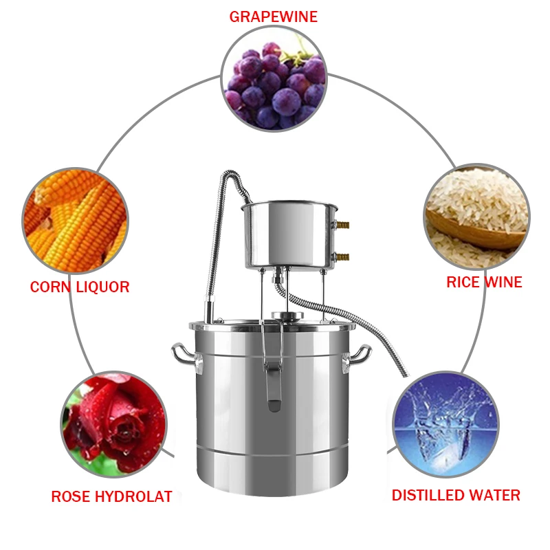 -Этот набор домашнего дистиллятора-это полный набор для производства вина. Его очень легко настроить и использовать, он особенно подходит для производства духов с сильным ароматом (бренди, виски, фруктовый бренди, Ecc.), также для эфирных масел (ароматов, средств и ликеров), но особенно для высококлассного спирта (водки). Также можно сделать чистую воду.