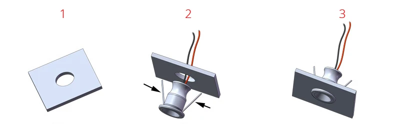 1. Открытое отверстие: 15 мм 2. Утопленный 3. Подключение к источнику питания 12 В