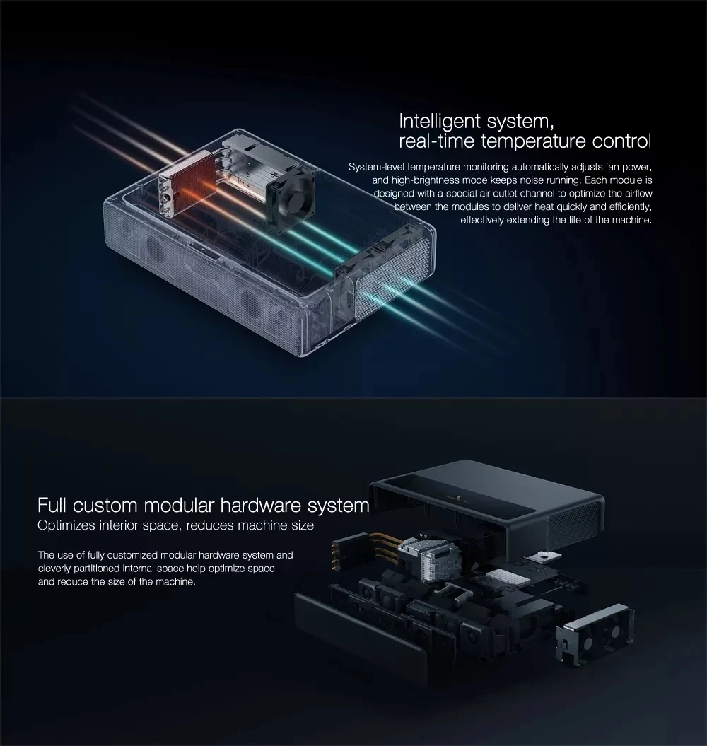 ● Изображение 4K, наслаждайтесь визуальным праздником ● Разместите непосредственно в шкафу для телевизора с большим экраном 80 - 150 дюймов ● Сверхкороткий фокус, нужно всего 24 см от стены, чтобы отбрасывать большой экран 100 дюйма, нет места, попрощайтесь с экраном ● ALPD 3,0, кинотехнология лазерного источника ● Коэффициент контрастности 3000:1, яркое изображение ● Высококачественное аудио, перевернутый трубчатый динамик, двойной Полнодиапазонный двухчастотный ● Интеллектуальное охлаждение, вентилятор контроля температуры в реальном времени ● Системный Язык: китайский (по умолчанию), английский. Часть китайского приложения может отображаться только на китайском языке.