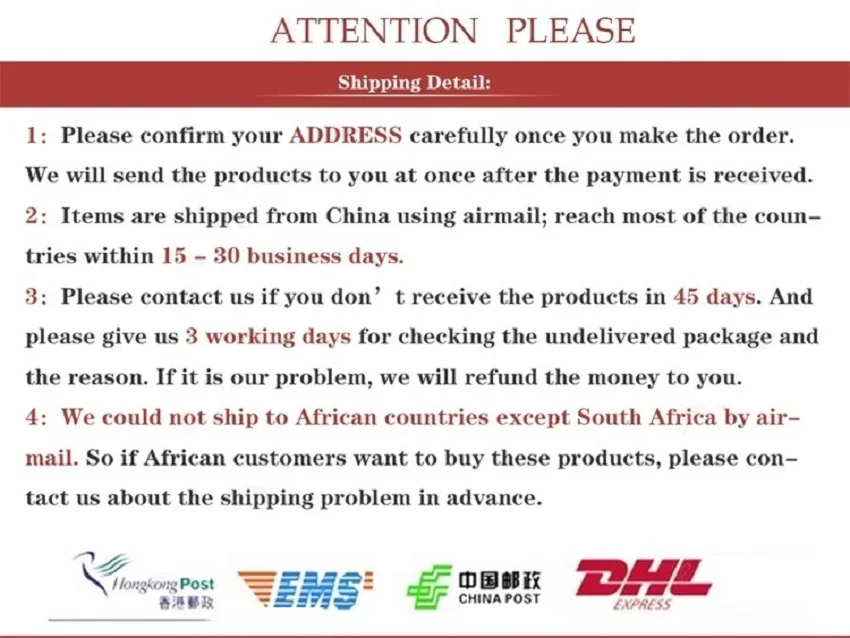 Примечание: Когда посылка прибудет на вашу таможню, пожалуйста, оплатите налог и забрать посылку, мы не несем ответственности за любые таможенные пошлины или налог на импорт. Если вы находитесь в удаленном месте, вам необходимо оплатить плату за доставку.