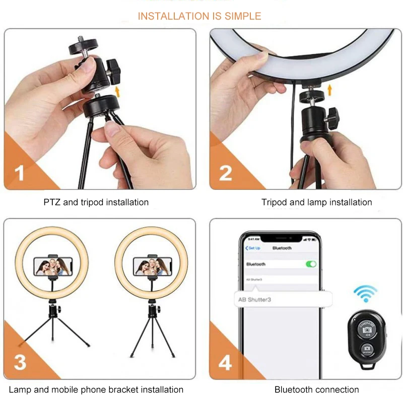 Регулируемый штатив: красивый кольцевой светильник, красивый и прочный, легко регулируется по высоте, надежно удерживает телефон, прост в использовании, прост в переноске и светильник достаточно высокого качества, что делает его складной настольный штатив или положить его на крытые и наружные полы.