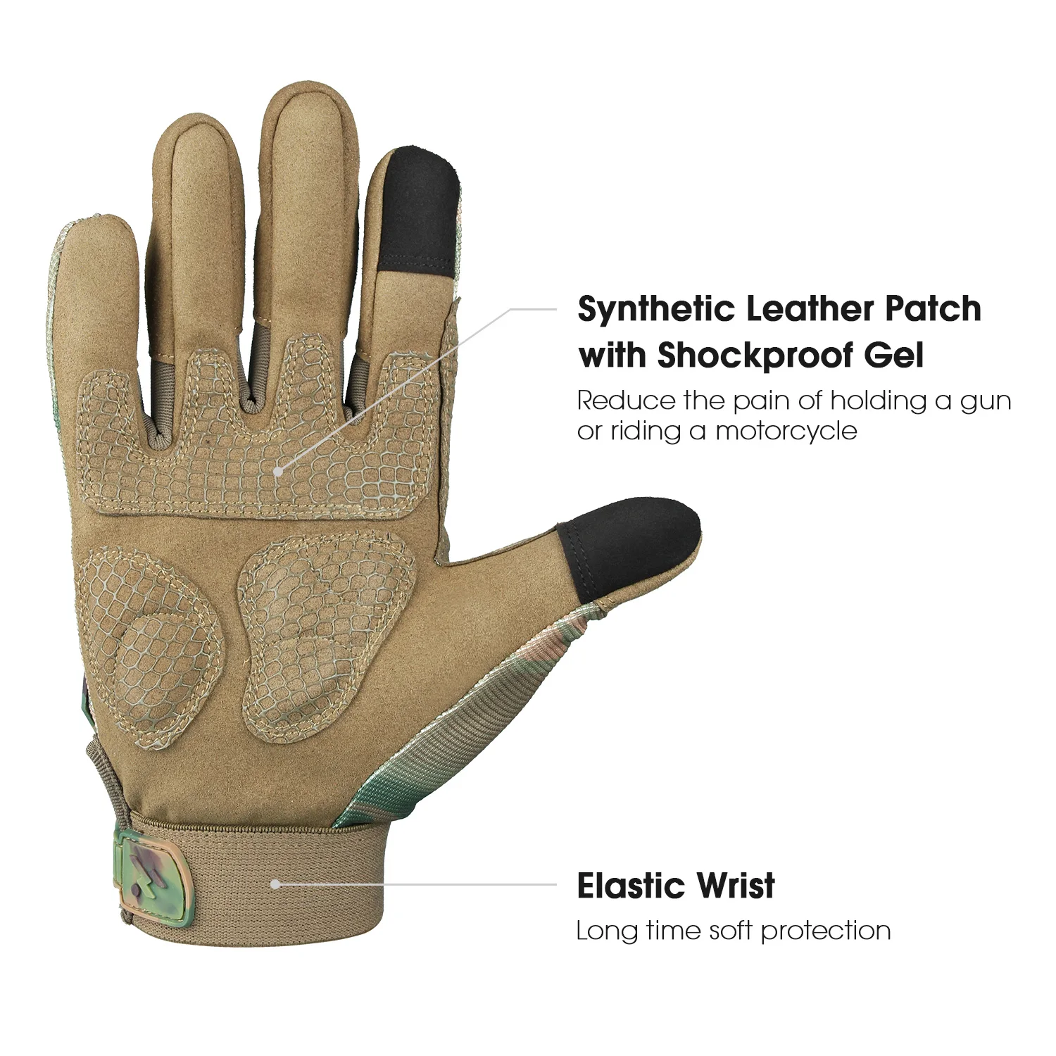 Максимальная защита от удара:Принимает более толстый силиконовый блок и прочный корпус защищает руки от ударов и царапин. Высокая износостойкость:Внешняя сторона из синтетической замши обеспечивает долговечность, а также дополнительную защиту от скольжения ладони. Регулируемая застежка-липучка на запястье:Экономьте свое время на охоте, скалолазании, стрельбе, кемпинге, армии и других наружных перчатках. Чувствительное прикосновение кончиков пальцев:Каждая перчатка имеет сенсорный экран s, надежность использования сенсорного экрана без потери тактильной ловкости.