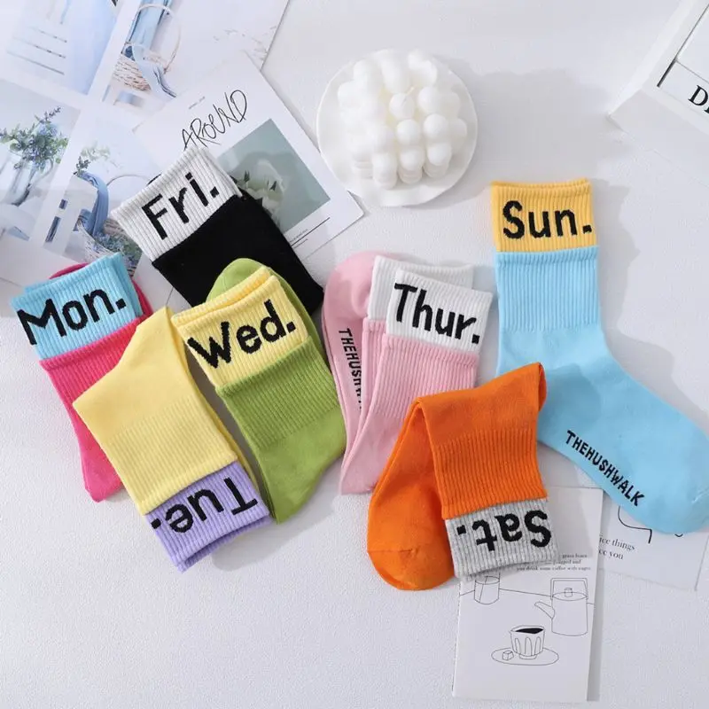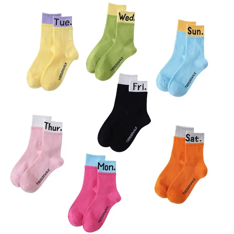 Женские и мужские двойные ребристые хлопковые носки для лодок неоновые яркого цвета в стиле пэчворк 7 дней недели буквы Harajuku носки скейтборд