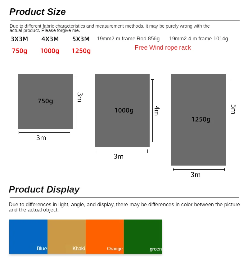 Описание Этот серебристый брезент 210T подходит для кемпинга на открытом воздухе. Сделайте ваше путешествие проще. Особенности -Ветрозащитный -Защита от ультрафиолета -Защита от брызг -Супер светильник Характеристики Вес: 3*3 м: 750 г/1.65lb 4*3 м: 1000 г/2,20 фунтов 5*3 м: 1250 г/2,76 фунтов Размеры: 3x3 м/4x3 м/5x3 м Материалы Цвет: хаки/зеленый/оранжевый/синий Основная часть: 210T Серебряный полиэстер Taft Водонепроницаемый индекс: 5000 мм Список 1 * брезент, 6 * направляющие веревки, 1 * сумка для хранения, 6 * пряжка, (опорный столб не входит в комплект.) Примечание: 18 висячих точек Уведомление Не включая столбы! Если вам нужен столб, вы можете нажать здесь -Мы рекомендуем стирать с моющим средством. -Все размеры измеряются вручную, допускается погрешность 1-3 см.