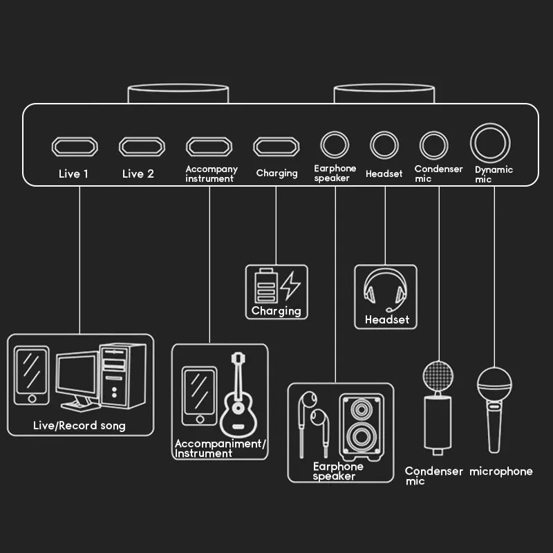2. Регулировка размера реверберации, регулировка громкости микрофона, высокая регулировка басов, управление громкостью записи, управление громкостью музыки, контроль громкости (функция наушников).