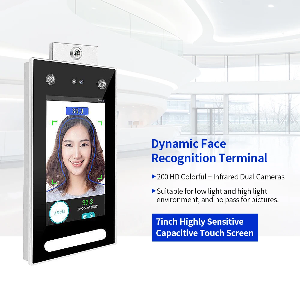 DT-10W относится к 7 дюймов измерением температуры распознавать лица терминал, который позволяет измерить температуру тела в тех случаях, когда люди проходит контроля доступа и сигнализации в чехол аномальной температуры тела. Подходит для офисных помещений, отелей, Ворот Доступа, офисных зданий, школ, торговых центров, магазинов, общественных организаций, общественных услуг и проектов управления и т. Д.