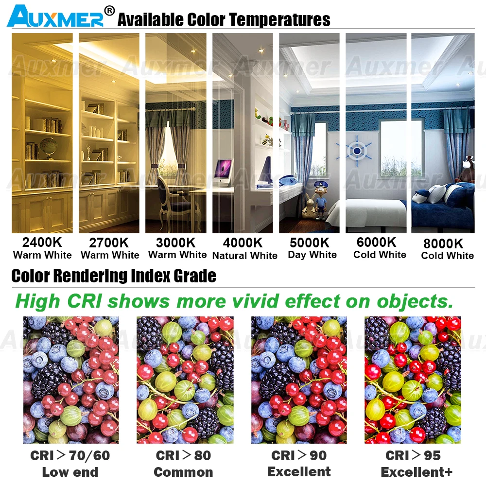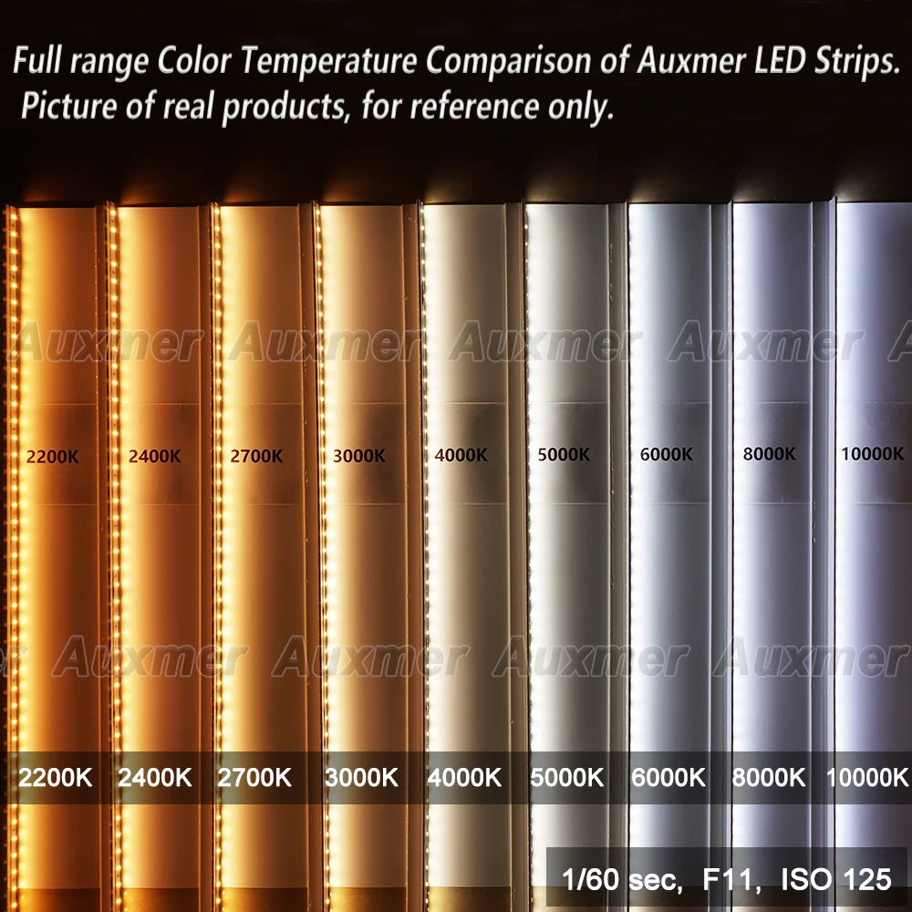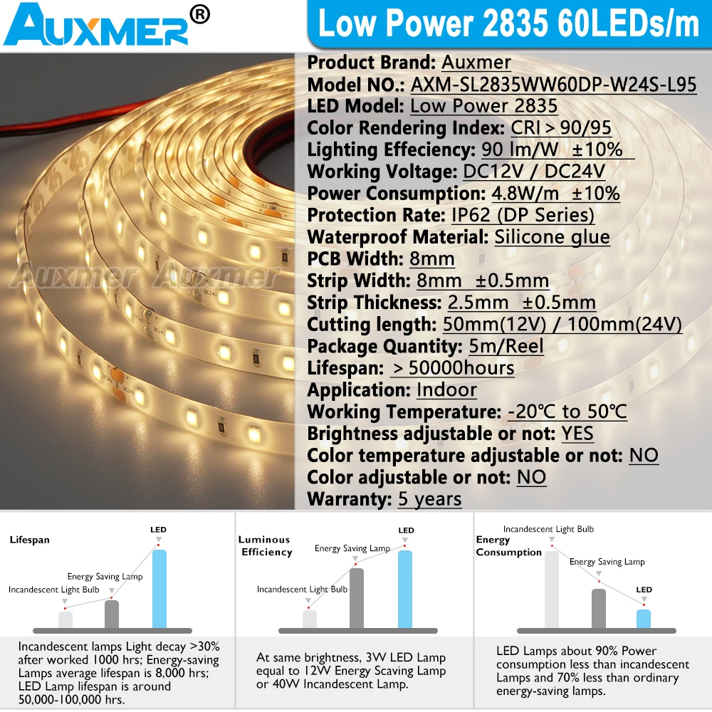 Auxmer такая же спецификация светодиодный полосы света делятся на входное напряжение DC12V и DC24V. Они имеют только различное входное напряжение. Но мощность, размер и эффективность работы одинаковы.