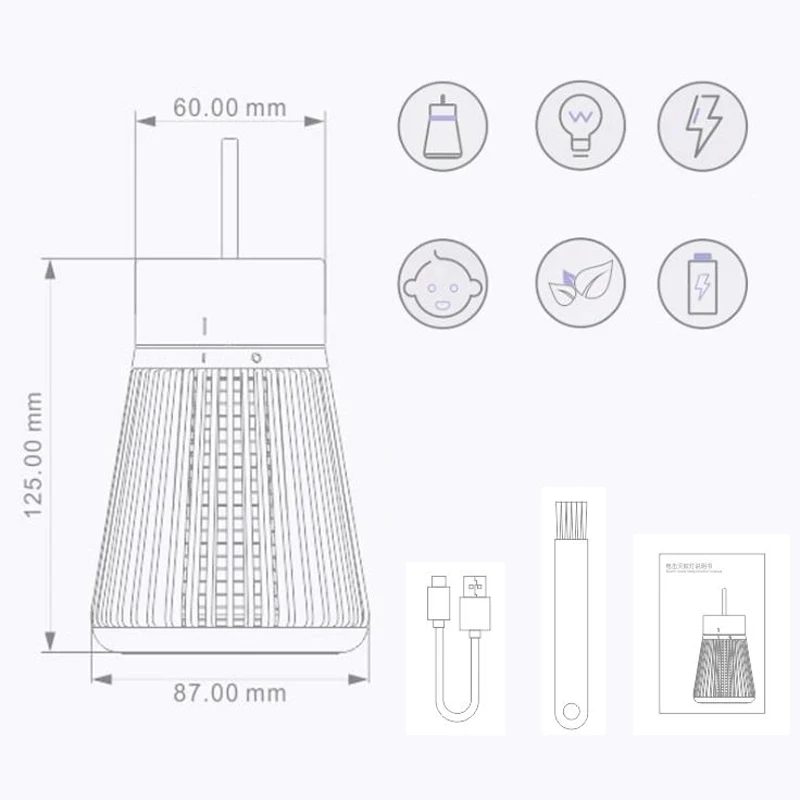 Характеристики: Размер изделия: 87*87*125 мм Вход: USB 5V 1A Мощность комаров: 1,2 W Напряжение сетки: 600 в Мощность 10 Вт
