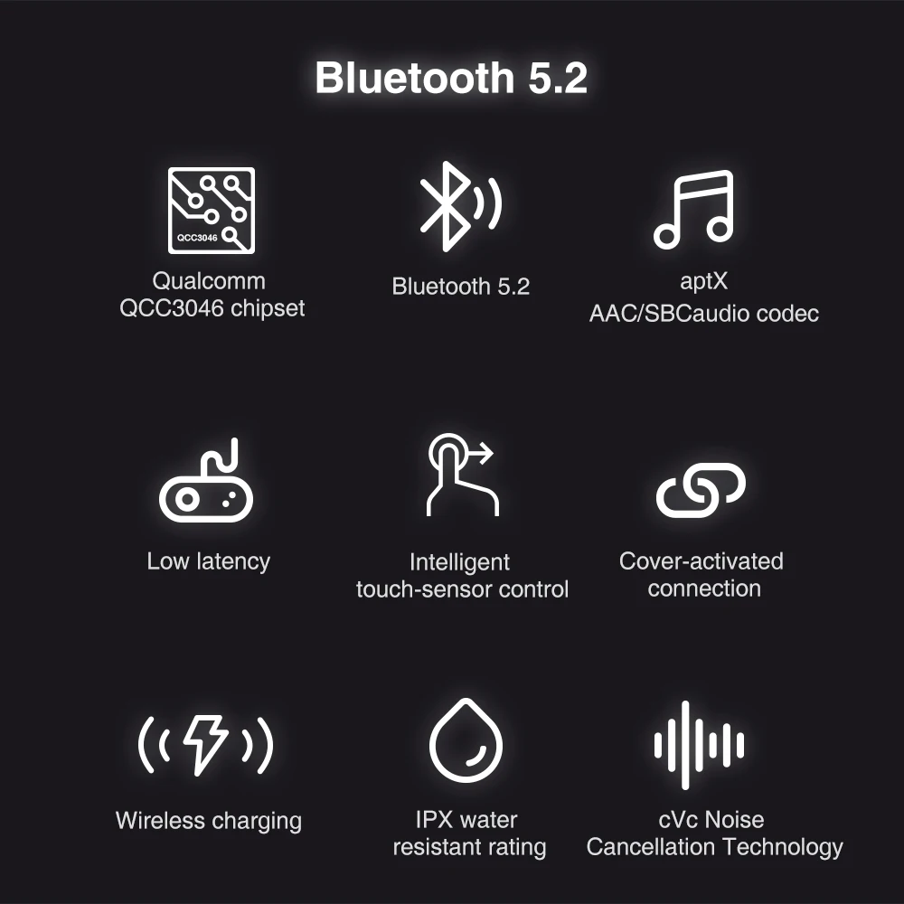 ♬【Умное Сенсорное управление и Беспроводная зарядка 】 умное сенсорное управление принесет комфорт и удобство. Бесшовное переключение между звонком и музыкой может быть таким крутым. Кроме того, он поддерживает беспроводную или проводную зарядку. Не беспокойтесь о том, чтобы забыть о зарядке. Сверхнизкое энергопотребление чипсета QCC3046 может длиться до 72 часов без необходимости перезарядки