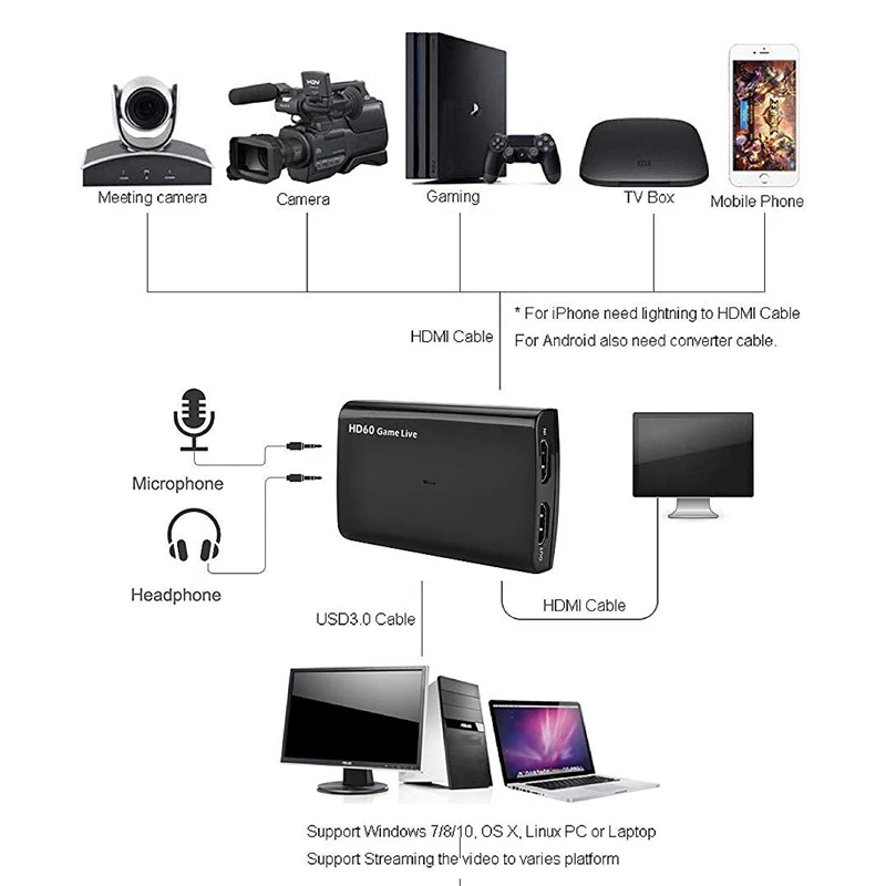 4K HDMI вход и выход, запись видео до 1080P 60fps. Работает с любыми 3nd вечерние программного обеспечения (OBS,VLC,PotPlayer,Vmix и так далее). Поддержка потокового видео RTMP, веб-трансляции и видеоконференций в Skype, Twitch,DailyMotion, Hitbox,Facebook live, Youtube Live, Livestream, Ustream,Dacast,Wowza Cloud...