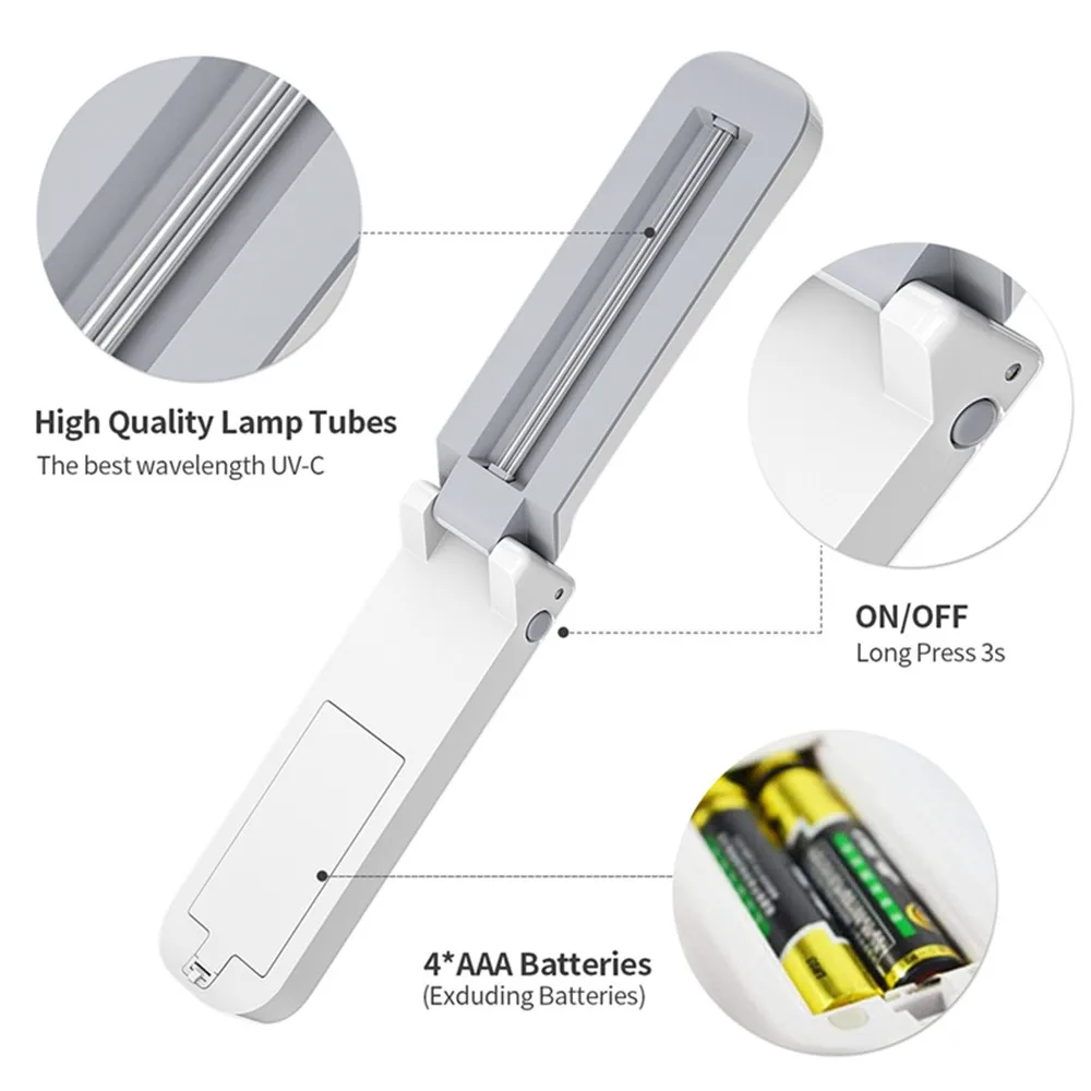 Портативный UVC светильник для дома, УФ-дезинфицирующая лампа, ультрафиолетовая личная гигиена, путешествия, УФ-дезинфекционная лампа светильник с холодным катодом, УФ-лампаОсобенности:1. Подходит для дома, офиса, деловых поездок, прогулок, туризма, легко носить с собой и использовать2. Используя ультрафиолетовый светильник, 99.99% можно удалить бактерии и формы, покрывающие бытовые продукты, и удалить запахи, бактерии и ринит, пневмонию, астму и аллергию.3. Поддерживать чистоту в комнате, шкафу и домашних предметах.4. Легкая раскладушка экономит место и может быть стерилизована в любое время5. Простое управление, просто нажмите кнопку переключения, чтобы стерилизовать6. Встроенный автоматический выключатель безопасности, ультрафиолетовый светильник автоматически отключается, когда вращающаяся трубка бактерицидной лампы обращена вверх в рабочем состоянии. Если вам нужно восстановить рабочее состояние, вам нужно только повернуть трубку бактерицидной лампы вниз7. Используется для личных ежедневных нужд, палочек для еды, ложек, посуды, телефонных наборов, столов, туалетов, общественных мест, автомобилей и т. д., чтобы избежать вреда микробов и бактерий, И обеспечить здоровую и здоровую среду жизни8. Может питаться от USB подключения (не может быть заряжен), также поддерживает 4 батарейки AAAОписание:Цвет: белыйВес: 100 гМатериал: АБС-пластикРазмер: L12.5 x W3.5 x H2.5cmUV-C трубка: 2 ВтСрок службы лампы: более 20000 часовДлина волны УФ: UV-C (253,7 нм)Интенсивность облучения: 2500uw / cm2Питание: USB и 4 батарейки AAA / 6 в (не входят в комплект)