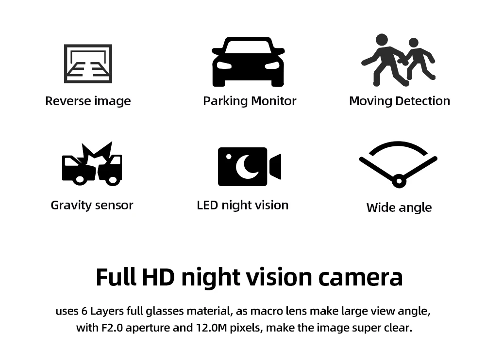 170 ° угол обзора реальный 170 ° Широкий угол обзора. Дисплей выглядит как рыбий глаз, стеклянные линзы, с широким поле зрения, опасные слепые пятна являются вещью прошлого.