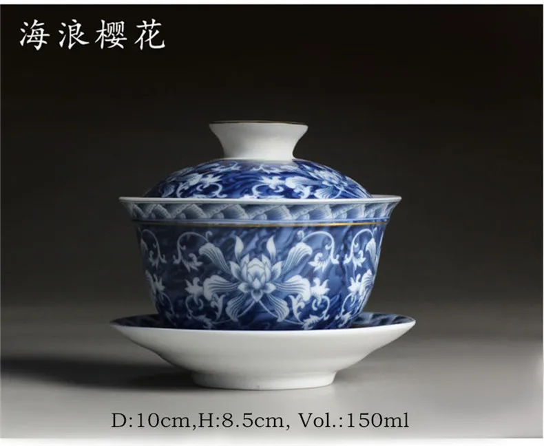 Tea Bowl Chinese Tea Set Jingdezhen Blue and White Porcelain Gaiwan Ceramic Tea Cup and Saucer Set Gold Painted Tea Tureen
