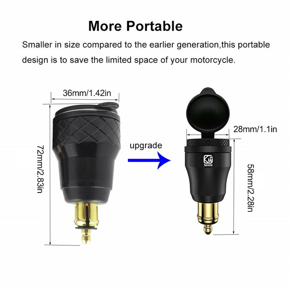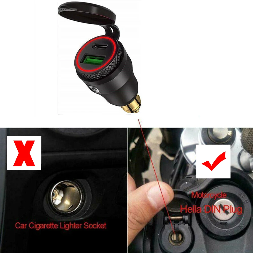 Features: *1. 100% brand new and high quality. *2. Charging solution for the motorcycle with a small DIN socket. Not applicable to standard cigarette lighters of automobiles. *3. QC3.0 USB and Type C PD fast Charger for motorcycle Hella / DIN (for BMW Motorcycles style power socket). *4. Not only for USB charge cable, but also for Type C charge cable. *5. This motorcycle plug is made to fit for Hella / DIN or for BMW style motorcycle power sockets.(also work for Ducati and Triumph Motorcycles) *6. With Type C and USB fast charge output for Mobile Phone,tablet,Camera,GPS,PM3,PSP and more. *7. This motorbike plug has been made to fit for Hella / DIN or for BMW style motorcycle power sockets (Compatible For BMW Motorcycle F800GS F650GS F700GS R1200GS R1200RT and more). *8. For European motorcycles such as Ducati Motorcycles. *9. IP66 Water resistant weather cap,Aluminum shell. *10. Power / charge two mobile devices simultaneously. *11. Use this plug along with your devices own USB or Type C data cable in order to charge, ideal for many GPS and smart phone devices *12. Smaller than the usual plug for vehicle / car cigarette lighters, this bike plug has been made to fit Hella / DIN or for BMW style motorcycle power sockets. Specifications: Item Type: Motorcycle Dual USB Charger Material: Aluminum alloy Product Color: Black/Red LED light color: Red/Blue Size: 58x28cm Input voltage: DC 12V-24V USB Output : DC 4.5V/5A,5V/4.5A,9V3A,12V/2.A(Max) Type C output: DC 5V/3A,9V/3A,12V/2.5A,15V/2A,20V/1.5A(Max) Note: Input must be 24V to achieve 15V 20V output Quantity: 1 PC (other accessories in the picture is not included) Package includes: 1 * Motorcycle QC3.0 USB Type C PD Charger Note: (1) All pictures are professionally colored, but due to the different ambient light and different display device settings, there may be some deviations between the pictures you see and the items themselves. Please understand. (2) The data is measured manually, and there may be some deviation, but it does not affect the use.