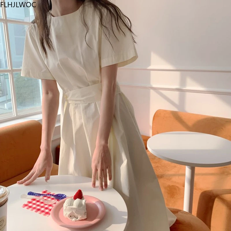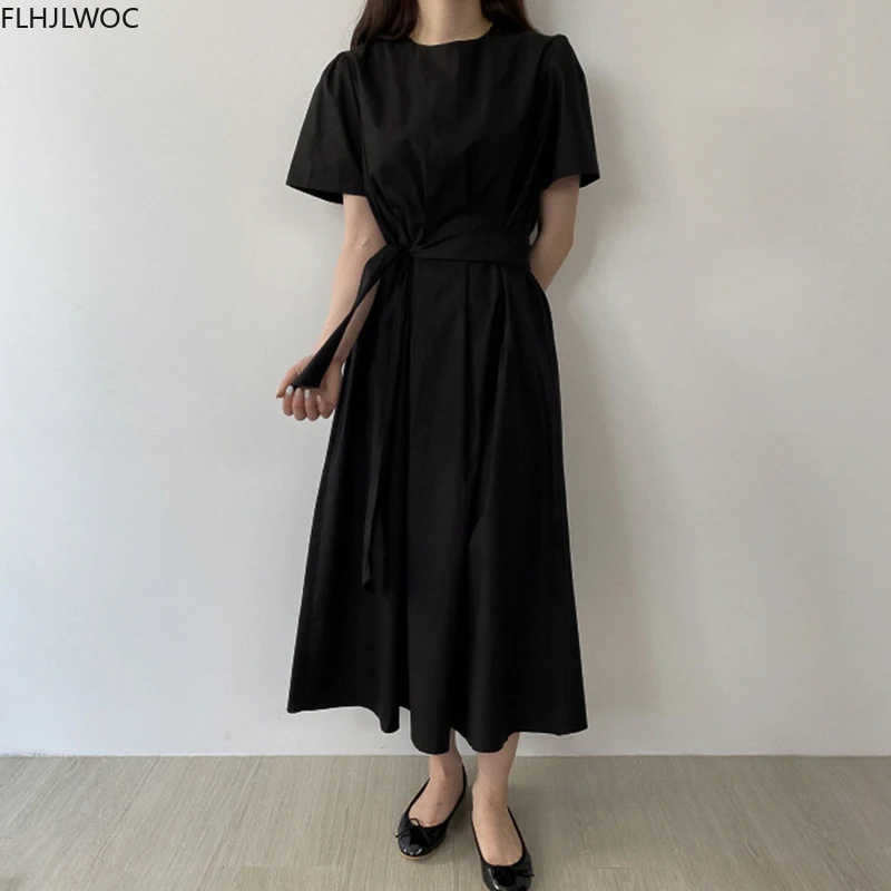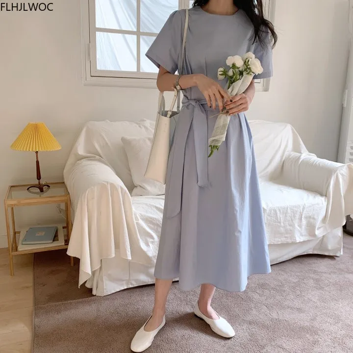 Корейское шикарное длинное платье, летнее ТРАПЕЦИЕВИДНОЕ винтажное платье с коротким рукавом и бантом на шнуровке, женский из смеси хлопка Flhjlwoc