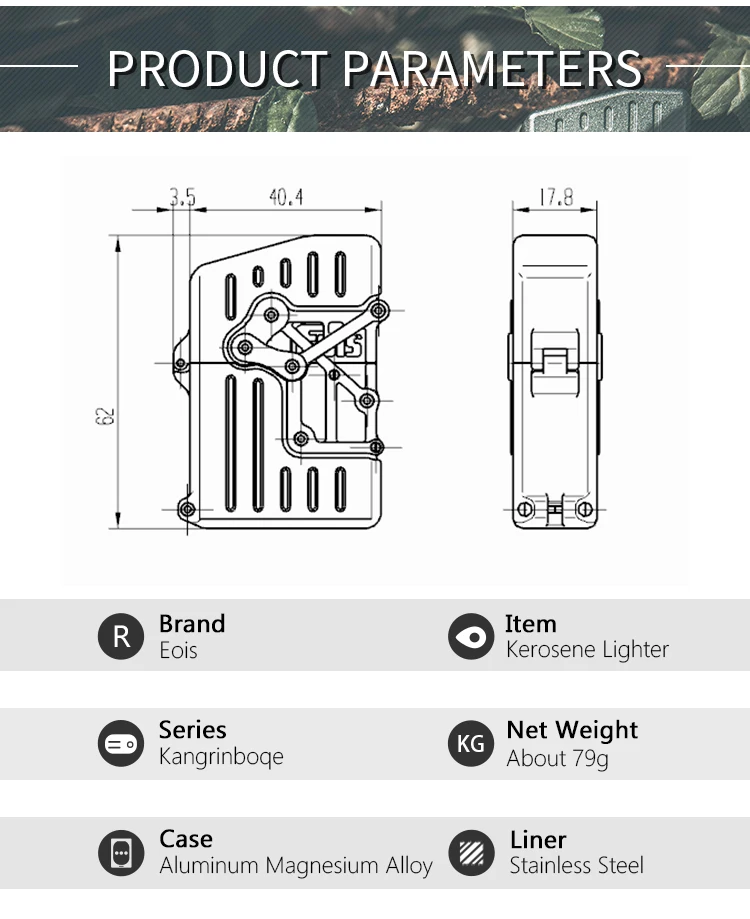 Название бренда: Eois Серия брендов: Mechanic Артикул: зажигалка Тип изделия: керосиновая зажигалка Номер модели: E-D0004 Материал корпуса: сплав Материал вставки: нержавеющая сталь Чехол: резной дизайн Логотип: лазерная маркировка Вес нетто: около 79 г Посылка в комплекте: зажигалка + подарок (Flints + хлопковый сердечник + инструмент для выживания) + изысканная коробка Советы: из-за логистических ограничений в новой зажигалке Нет топлива.