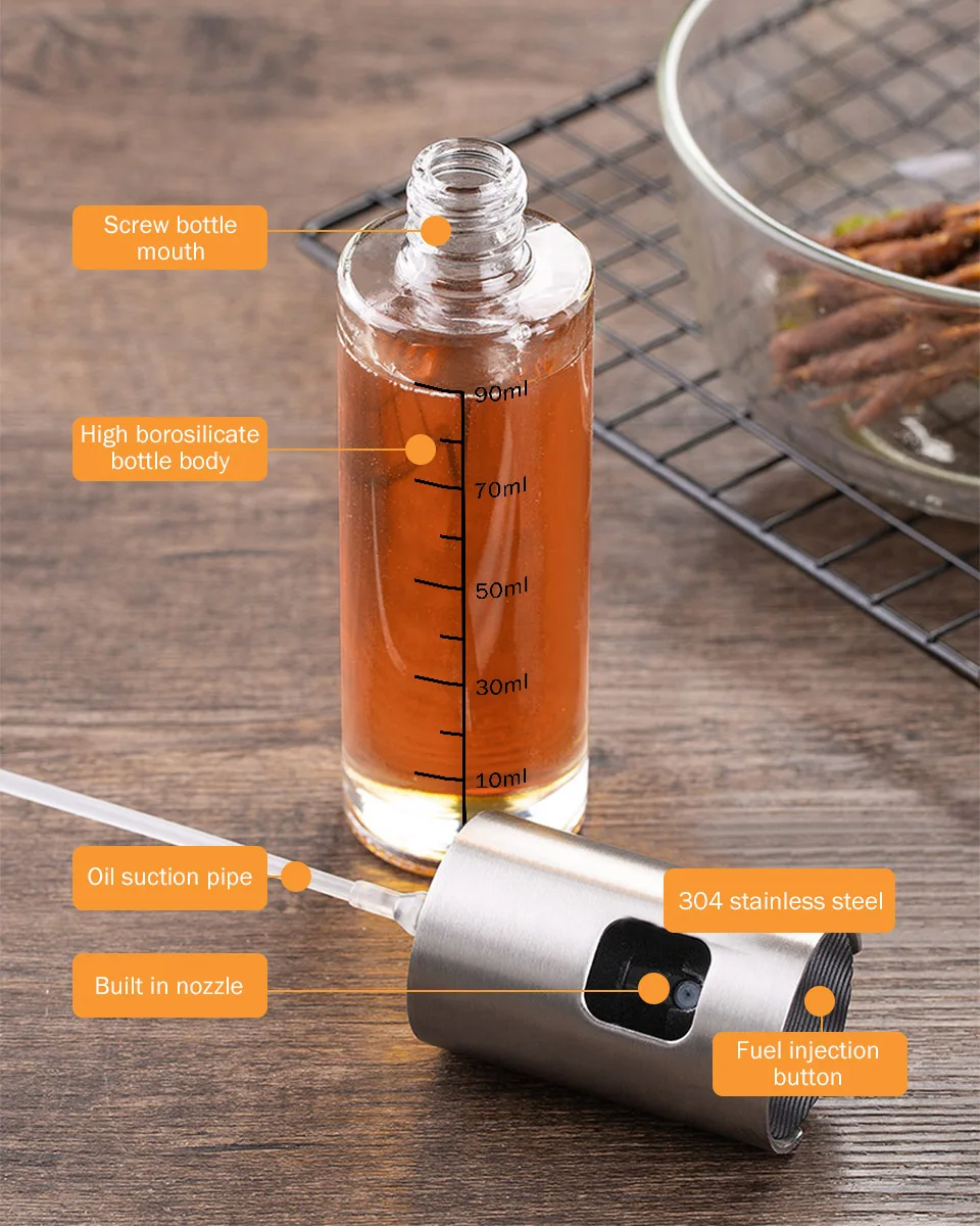 1. Безопасный материал: масляный распылитель изготовлен из боросиликатного стекла и нержавеющей стали 304. Боросиликатное стекло считается самым безопасным стеклянным материалом в мире. Безопасный и нетоксичный, он широко используется в кухонных инструментах, пожалуйста, используйте его с уверенностью