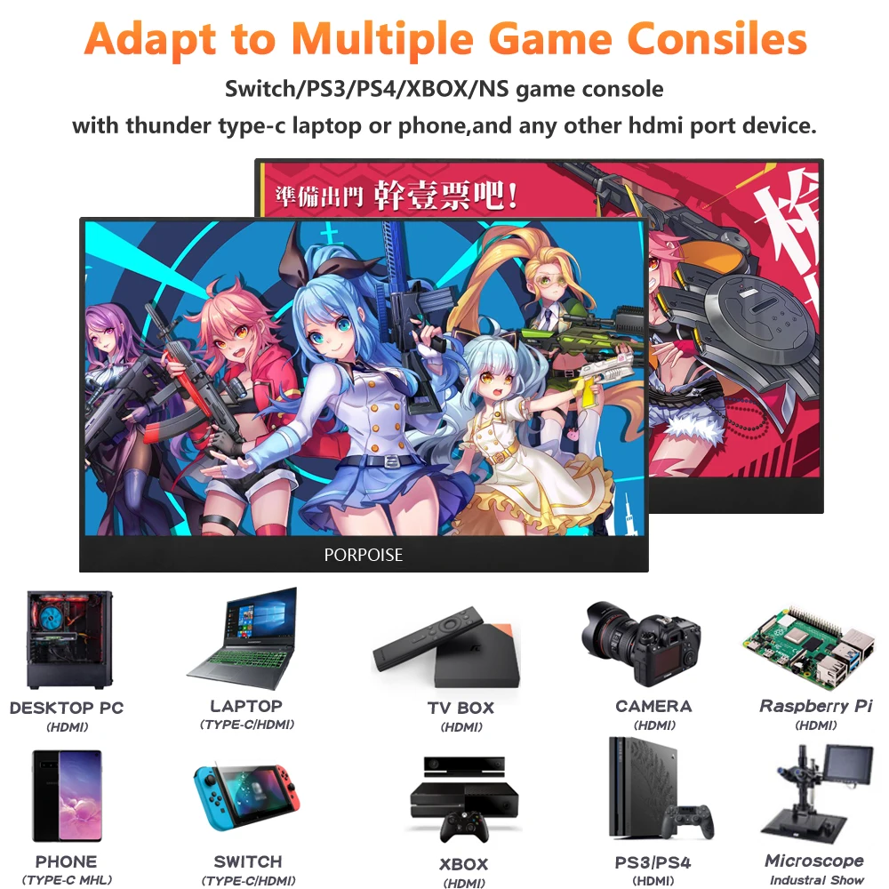 1. Поддержка различных внешних устройств, таких как компьютеры, ноутбуки, мобильные телефоны, для PS3/для PS4/для игровой консоли XBOXOne, колонки, камеры. 2. Поддержка 1080P HD, маленький и изысканный, легко носить с собой. 3. Поддержка высокой динамической рендерации освещения (HDR). 4. Многоэкранный дисплей с повседневным переключателем, подходит для офиса, игр, дизайна и так далее.