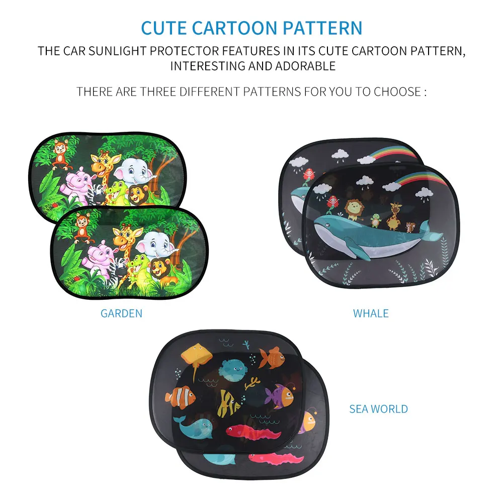 Защита от солнечного света автомобиля отличается милым мультяшным рисунком, интересным и очаровательным. Вы можете выбрать три разных узора: сад животных, Кит и морской мир, особенно привлекательный для детей.