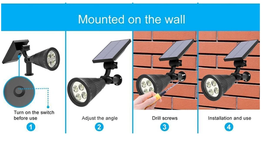 4. Полностью Регулируемый блок на 180 градусов позволяет использовать освещение точно там, где это необходимо, и ловить Солнечный свет под оптимальным углом для зарядки; Автоматическое выключение в день обеспечивает освещение точно при необходимости.