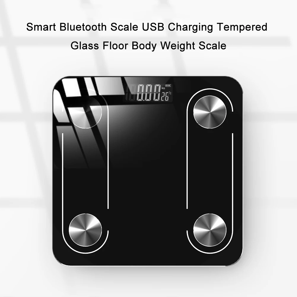 Feature: The thermometer with temperature sensor can know the change of room temperature when weighing. Automatic switch machine, energy saving and environmental protection, using gravity sensor system,automatically turn on after weighing, and do not use automatic shutdown after weighing for about 5-10 seconds. USB charging, charging for 1 hour, weighing 90 days. Every detail is exquisite, tough, durable, not easy to scratch. High-quality tempered glass, said gravity is very strong -700°C high temperature toughened, strong and durable, compressive, strong wear-resistant and compressive, can weigh 180kg. High-elasticity pads, non-slip and wear-resistant, fit the feet, more stable and effective to prevent rollover, double the safety. Specification: Color:Black/Dark Blue/Rose Gold Product size: 260*260mm/10.24*10.24" Scale surface material: tempered glass Base material: ABS Division value: 10g Weighing range: 0.2kg-180kg Power supply: USB charging Applicable models: for IOS8.0 and above, Android 4.3 and above, Bluetooth-compatible 4.0 and above Note: Due to the different monitor and light effect, the actual color of the item might be slightly different from the color showed on the pictures. Thank you! Please allow 1-3mm measuring deviation due to manual measurement. 1 X Data Cable 1 X Manual
