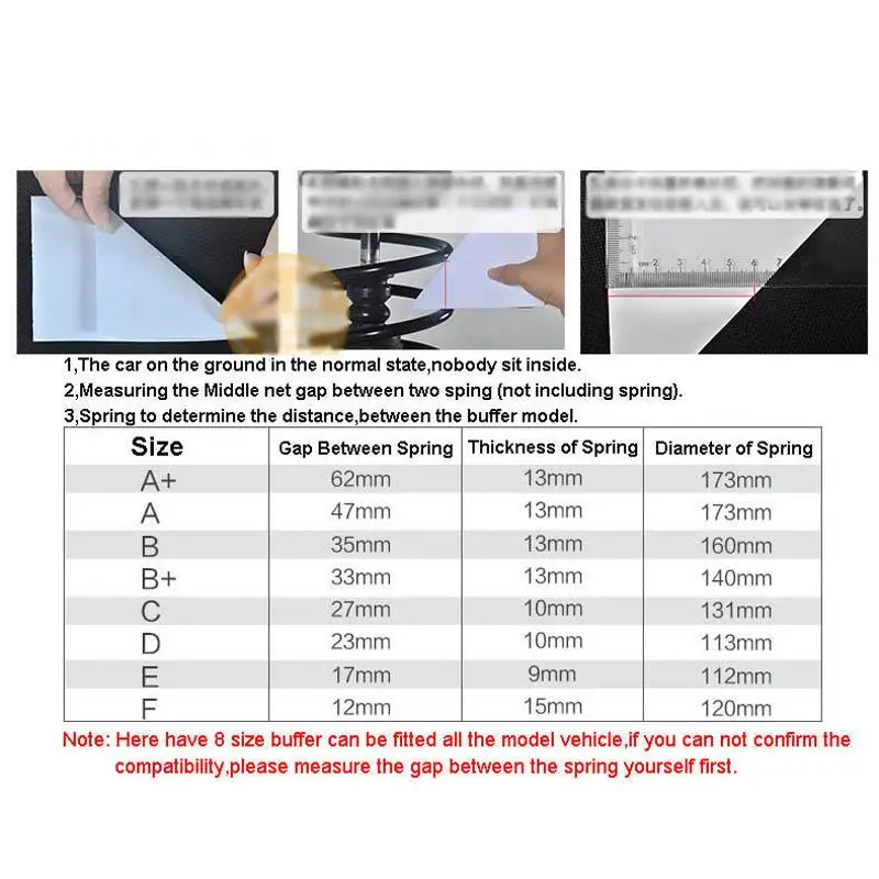 В каждой стране будет несколько различных моделей транспортных средств, если вы не согласны с совместимостью перед отправкой, пожалуйста, сначала Измерьте зазор между пружинами как метод ниже.