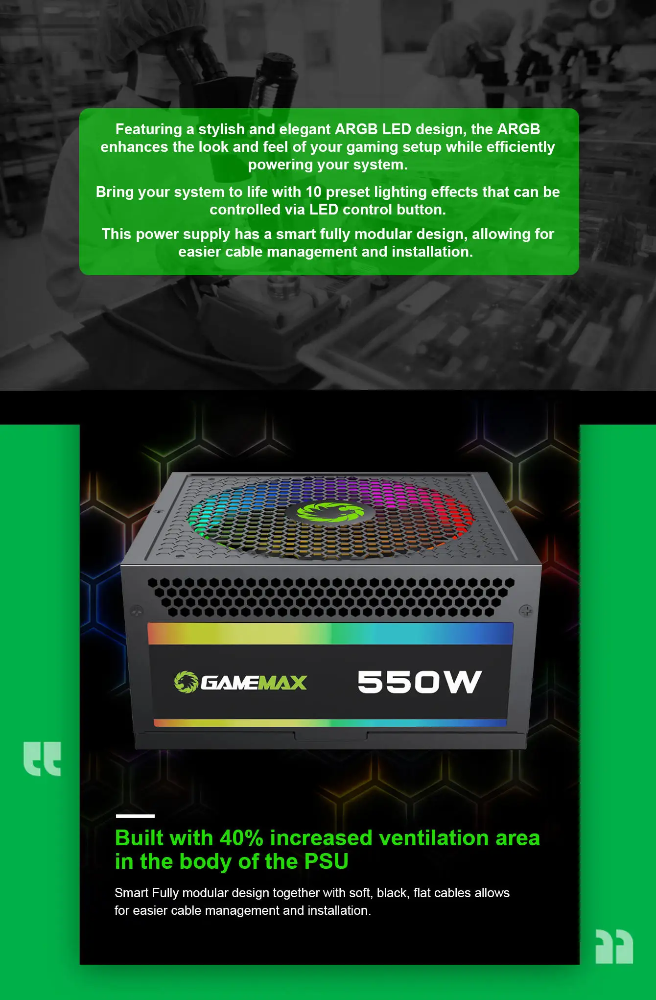 ⚡【Permance】 дизайн сотовой вентиляции для оптимального рассеивания тепла. 80 плюс золото сертифицировано, с 90% эффективности или выше при типичных нагрузках. Полностью модульная Выходная проволочная штанга, оптимизирует требования к маршрутизации. ⚡【Адресуемый контроллер RGB нажимайте переключатель контроллера RGB последовательно, огни переходят в Одноцветный режим и дышащие огни, режим смешивания цветов в свою очередь. ⚡【Самая высокая защита 】 мощные одиночные + 12V рельсы обеспечивают стабильный выход постоянного тока и поддерживают высококлассную графическую карту и систему ПК. Конденсаторы уровня A + обеспечивают высочайшую стабильность, долговечность и надежность, в комплект входит Электрическая защита OPP/OVP/UVP/SCP/OCP. ⚡[Наш бренд] gamemax занимается производством компонентов для ПК и предоставляет услуги OEM для известных брендов с 2003 по настоящее время. Продукция GAMEMAX имеет несколько международных стандартов безопасности, включая CB, CCC, FCC, CE и т. д. В комплект входит OPP/OVP/UVP/SCP/OCP Электрическая защита.