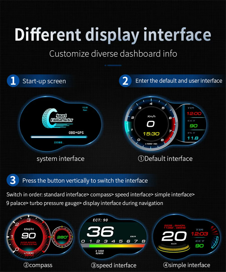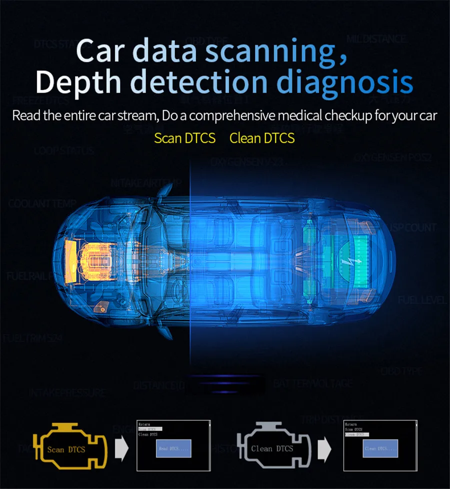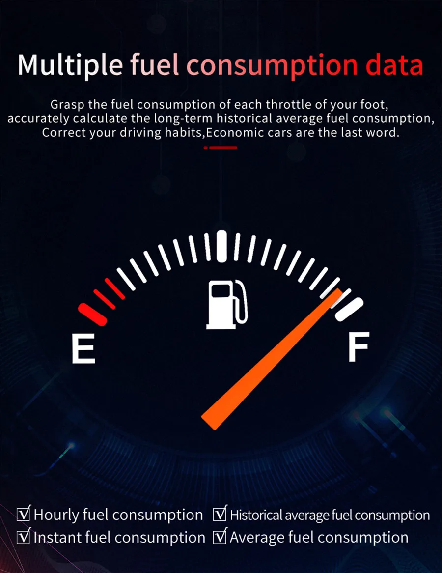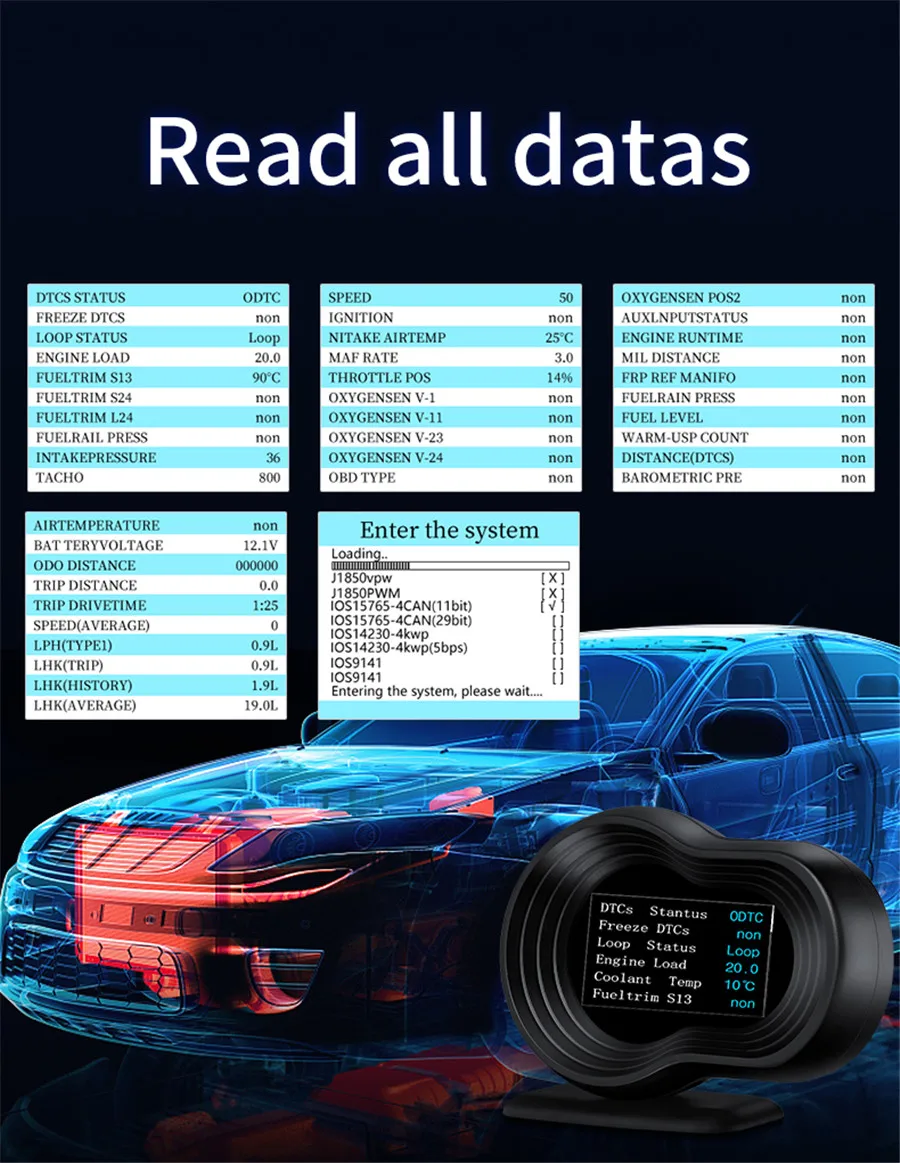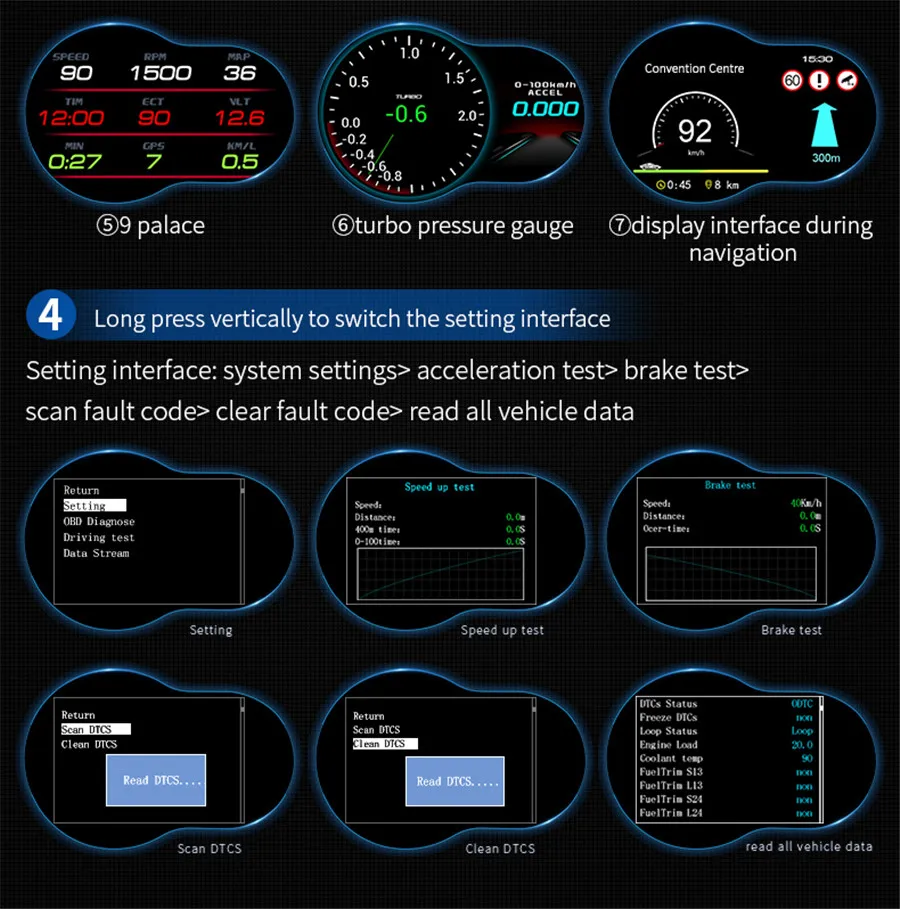 Информация о БД: скорость транспортного средства, об/мин двигателя, температура воды, напряжение, мгновенный расход топлива, средний расход топлива, измерение расстояния вождения, время вождения, турбо-тест, ускорение конкурентного режима, режим тестирования производительности тормозов, отображение детального кода facult в текстовом виде и очистка кода неисправности
