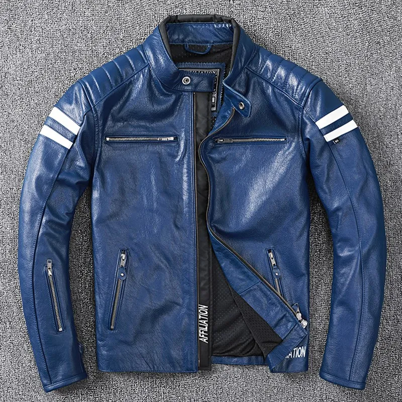 Отзывы о Мужская Байкерская кожаная куртка синяя облегающая мотоциклетная из