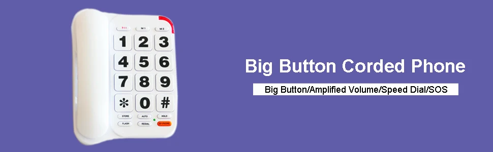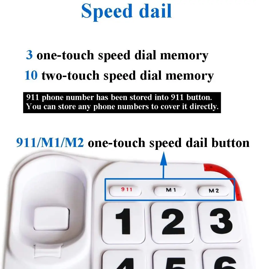 Усиленный звук-проводимый Телефон использует передовую технологию, которая может повысить голос, подходит для пожилых людей или людей с ослабленным слухом, сделать вызов более четким; Очень большие кнопки-номера на стационарном телефоне очень большие, которые могут храниться для двухсенсорного скоростного циферблата, есть также три кнопки с одним касанием, вы можете использовать их, чтобы позвонить своим близким или друзьям, просто нажав одну или две кнопки; Легко настроить-большая кнопка телефона будет работать при подключении телефона к стене телефона с помощью прямой телефонной линии, входящей в коробку. Не нужно никаких батарей или постоянного тока. Этот экстренный телефон sos по-прежнему работает при отключении питания; Регулировка громкости-громкость звонка, громкая связь и приемник регулируются, и эта функция позволяет усиленному телефону удовлетворить потребности большего количества клиентов; Яркий светодиодный светильник S-светодиодный светильник-индикатор для входящих звонков и в рабочем состоянии делает его более удобным для пожилых людей