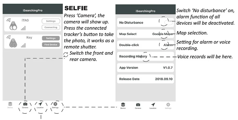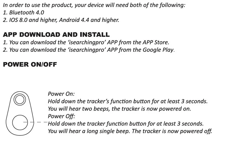 Этот продукт представляет собой беспроводное устройство Bluetooth, работающее под управлением приложения isearchingpro. Перед использованием необходимо разместить вещи, которые легко потеряются вместе с изделием. В диапазоне эффективного подключения Bluetooth (около 25 метров/75 БФТ без барьера) Вы можете издавать звуковой сигнал, чтобы найти потерянные вещи с помощью приложения вашего телефона, вы можете дважды щелкнуть кнопку, чтобы вызвать звонок на ваш телефон, и вы можете использовать продукт для съемки фотографий. (С этими особенностями, Вы сможете легко найти все, что захотите. Например, ключи, сумки, пульт дистанционного управления, кошелек, мобильный телефон...)