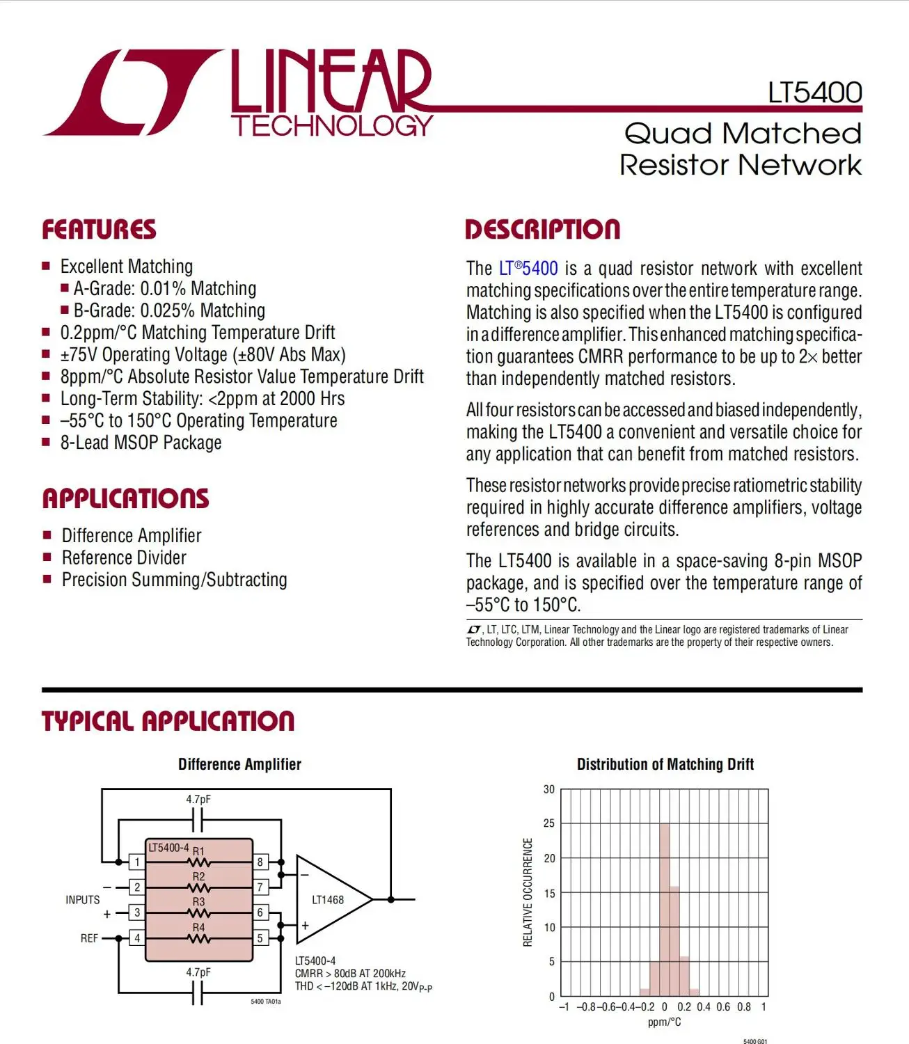 LT5400 Высокоточный низкотемпературный Дрифтерный резистор сети LT5400-это сеть из четырех подходящих резисторов, которая имеет соответствующие характеристики по всему диапазону температур. Когда LT5400 настроен в дифференциальном усилителе, также указывается соответствие. Эта Улучшенная Спецификация соответствия гарантирует, что производительность CMRR в 2 раза выше, чем при использовании независимых подходящих резисторов. Все 4 резистора можно использовать индивидуально и предвзято, что делает LT5400 удобным и универсальным выбором для любого применения, которое может извлечь выгоду из подходящих резисторов. Эти сети резисторов обеспечивают точную пропорциональную стабильность, необходимую в высокоточных дифференциальных усилителях, источниках напряжения и мостовых цепях. В LT5400 доступен в обеспечивает экономию места • 8-pin MSOP посылка и имеет определенный диапазон рабочих температур от-55 °C до 150 °C