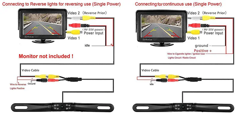 7. Видео кабель подключен к монитору, и кабель питания подключен к мощности заднего фонаря автомобиля. При реверсе система мониторинга заднего хода автоматически начинает работать, и вы можете четко видеть ситуацию за автомобилем