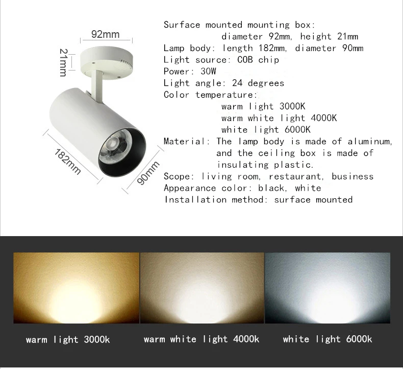 Поверхностного монтажа Монтажная коробка: диаметр 63 мм, высота 24 мм корпуса лампы: длина 162 мм, диаметр 60 мм светильник источник света: COB Чип Мощность: 7 Вт/12 Вт светильник Угол обзора: 24 градуса Цветовая температура: теплый Светильник 3000K теплый белый светильник 4000K белый светильник 6000K Материал: корпус лампы изготовлен из алюминия, И потолочная коробка изготовлена из изоляционного пластика. Область применения: гостиная, ресторан, бизнес внешний вид цвет: черный, белый Способ установки: монтируемая поверхность Монтажная коробка: диаметр 78 мм, Высота 26 мм корпус лампы: длина 172 мм, диаметр 76 мм светильник источник света: COB Чип Мощность: 20 Вт светильник угол: 24 градуса Цвет температуры: Теплый Светильник 3000K теплый белый светильник 4000K белый светильник 6000K Материал: корпус лампы изготовлен из алюминия, а потолочная коробка изготовлена из изоляционного пластика. Область применения: гостиная, ресторан, бизнес внешний вид цвет: черный, белый Способ установки: монтируемая поверхность Монтажная коробка: диаметр 92 мм, Высота 21 мм корпус лампы: длина 182 мм, диаметр 90 мм светильник источник света: COB Чип Мощность: 30 Вт светильник угол: 24 градуса Цвет температуры: Теплый Светильник 3000K теплый белый светильник 4000K белый светильник 6000K Материал: корпус лампы изготовлен из алюминия, а потолочная коробка изготовлена из изоляционного пластика. Область применения: гостиная, ресторан, бизнес внешний вид цвет: черный, белый Способ установки: Поверхностный монтаж