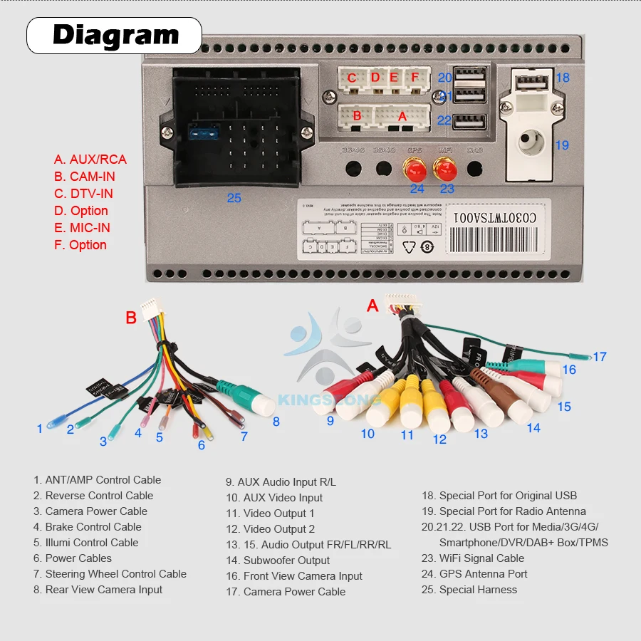 General - Power Supply: DC 12V (allowance range: 10.8-14.5V) - Max. Current: 10A - Screen Size: 8 inch - Front panel Size: 260mm(Top width)*120mm(High)*240mm(Bottom width) - Package Size: 340mm*270mm*200mm - Shipping Weight: 3.0kg System - Operation System: Google Android 10.0 - CPU: MT8321A 1300MHz Cortex A7 - RAM: 2GB - Internal Memory: 16GB - Extended Card/USB: Support USB/SD up to 64GB Display - Screen Type: Multi-touch screen - Multi-windows view: Yes, support Split Screen, you can run two apps side by side - Resolution: 1024*600 - Capacitive or Resistance Screen: Capacitive - Built-in Clock and Calendar: Yes, show real time and can use network-provided time - Main Menu Status Bar display: Can be changed to Music/Radio/BT-Stereo Player and Clock/Date/Week - Change Wallpapers: built-in 2 live wallpapers, 7 standard wallpapers, support User's wallpaper - Change Apps-Icon Position: Yes Internet - WiFi Internet: Built-in WiFi Module, support 802.11b/g/n, support WiFi Hotspot - 3G/4G Internet: USB 3G/4G Dongle not included, just contact us to buy it together - Explorer: Opera, UCWeb, SkyFile, Dolphin and more explorer for your selection - Online Entertainment: Online Video, TV, Movie, Music, Radio, Video Chat - Online Navigation: Online Google Maps Navigating - Online Games: Yes, online play or you can download it from google play store - Online Communication: keep connected through WhatsApp, WeChat, Twitter, Facebook, Gtalk, Gmail... - Read and edit Office Software: Yes, support Word, Excel, Powerpoint, PDF, TXT Audio - Format: MP3, WMA, MP2, OGG, AAC, MA4, FLAC, APE, WAV etc. Could play via song list - Record: MP3, WMA - Other: LRC synchronized display; ID3 search; Search by files; Album Picture; User-defined audio effect - Audio IC: Top Global Cirrus IC, independent audio decoding - SNR: Noise rations:=90dB Video - Format: Support AVI (H.264, DIVX, XVID), rm, rmvb, MKV (H.264, DIVX, XVID). WMA, MOV, MP4 (H.264, MPEG, DIVX, XVID). DAT (VCD format). VOB (DVD format). PMP, MPEG, MPG. FLV (H.263, H.264). ASF, TS, TP, 3GP, MPG ect. =30 formats, Playing internet video directly (while downloading) - Play: Up to 1920*1080 Pixels, 30Mb. Fluent play without light spot - Video Output: Common Video Output (AV) GPS - Operation System: Android 10.0 - Support Maps: IGO, Sygic, Waze maps for Android 10.0 - Support offline navigation: Yes, 16GB TF Card incl. - Dual Zone: Yes, navigating while music playing - Online Navi: Yes, support online navigating such as google maps Bluetooth - Hands Free: Yes - A2DP (Bluetooth Stereo Music): Yes, can play stereo music through Bluetooth - PB-Download: Yes, can download phonebook from mobile to this unit - PB-Search: Yes, can use the first letter to search contact member in PB-Listings - Calling Records: Yes, Dialed Call, Received Call, Missed Call - Built-in Microphone: Yes, on the front panel - External Microphone Jack: Yes, on the back, external Mic. incl. Radio - Main Chips: TEF6686 - AM Frequency Range: 522-1620KHz - AM Increment: 9KHz(EU)/10KHz(US) - FM Tuning Range: 87.5-108MHz - FM Increment: 0.05MHz(EU)/0.1MHz(US) - FM Area: Europe/USA1/USA2/Japan/Russia - RDS: On/Off - Preset Stations: 30(FM 3*6, AM 2*6) USB - Position: 4 USB On the Back - Function: Can be connected with U-Disc, 3G/4G Dongle, CarPlay Dongle, TPMS-Device, DVR-Camera, DAB+ Box, Smartphone etc. - Capacity: 64GB - Play MP5 Videos: Yes, can play RMVB Videos up to 1080P TF - Position: On the front panel - Function: Can be used as Multimedia card or GPS card slot. - Capacity: 64GB - Play MP5 Videos: Yes, can play RMVB Videos up to 1080P Mirror Link - Ready to use: Yes - Built-in Mirror Link App: Yes, the name is EasyConnection - Support Device: iPhone iOS 7.1 and above, Android phone with Android 5.0 and above - Connection: iPhone via WiFi and Android Phone via WiFi or USB - Unit's Screen Control Phone: Just support the most of Android SmartPhones CarPlay & Auto - Built-in: No, need to buy a USB CarPlay & Auto Dongle to use this function - App: Special APP for CarPlay & Auto Dongle - Support Device: iPhone iOS 7.1 and above, Android phone with Android 5.0 and above - Connection: USB - Unit's Screen Control Phone: Just support the most of Android SmartPhones Car DVR - Built-in Car Recorder App: Yes, just connect a USB Camera to use this function - Support HD CCD Camera: Yes - Play recorded Video directly: Yes - Storing Position: Card/USB Storage can be changed TPMS-IN - Built-in TPMS App: Yes, just connect a TPMS Module to use this function - Connection Port: USB - Power Supply to TPMS Module directly: Yes - Touch Control: Yes DAB(+)-IN - Built-in DAB Player App: Yes, just connect a DAB+ Box to use this function - Connection Port: USB - Power Supply to DAB+ Box directly: Yes - Touch unit's screen to control the connected DAB+ Box: Yes DTV-IN - Built-in DAB Player App: Yes - Connection Port: Special - Power Supply to connected DTV Box directly: Yes, you can connect our DTV Box to achieve this function - Touch unit's screen to control the connected DTV Box: Yes, you can connect our DTV Box to achieve this function Additional - Textbook: Could change font, font color, background color, bookmark, reading E-book while listening music - Photo Viewer: Support JPS, BMP, PNG, GIF etc. format. play by revolve, Powerpoint Support 4096*4096 Pixels - APK Installer: Support Android Package installer - Support Torque Pro(OBD2 &Car): Yes, you can connect a Bluetooth OBD2 Scanner Tool to use this function - Support steering wheel control, built-in CanBus decoder (it cost GBP30 in the market) included - Support panel light colors adjustment, many RGB-colors can be chosen - Support Android Multimedia Player, can play Music/Video/Photo from local USB/TF Input - AUX Video In: One - Rear-View Camera Video In: One - External Microphone In: One - AUX Audio In: R/L - TPMS Box In: One - DTV Box In: One - DAB+ Box In: One - Car DVR In: One Output - Video Out: Two - Audio Out: FR/FL/RR/RL - Surround Stereo Out: 4*45w - Sub