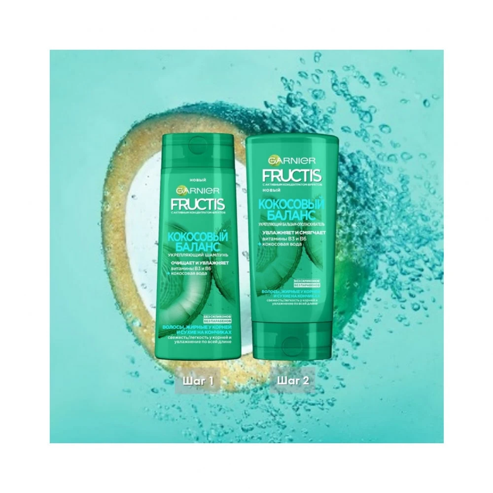 Уникальная формула шампуня для волос FRUCTIS Кокосовый Баланс без силиконов, обогащенная кокосовой водой и витаминами В3 и В6, очищает у корней и увлажняет до самых кончиков. Результат: свежие у корней и увлаженные волосы по всей длине.