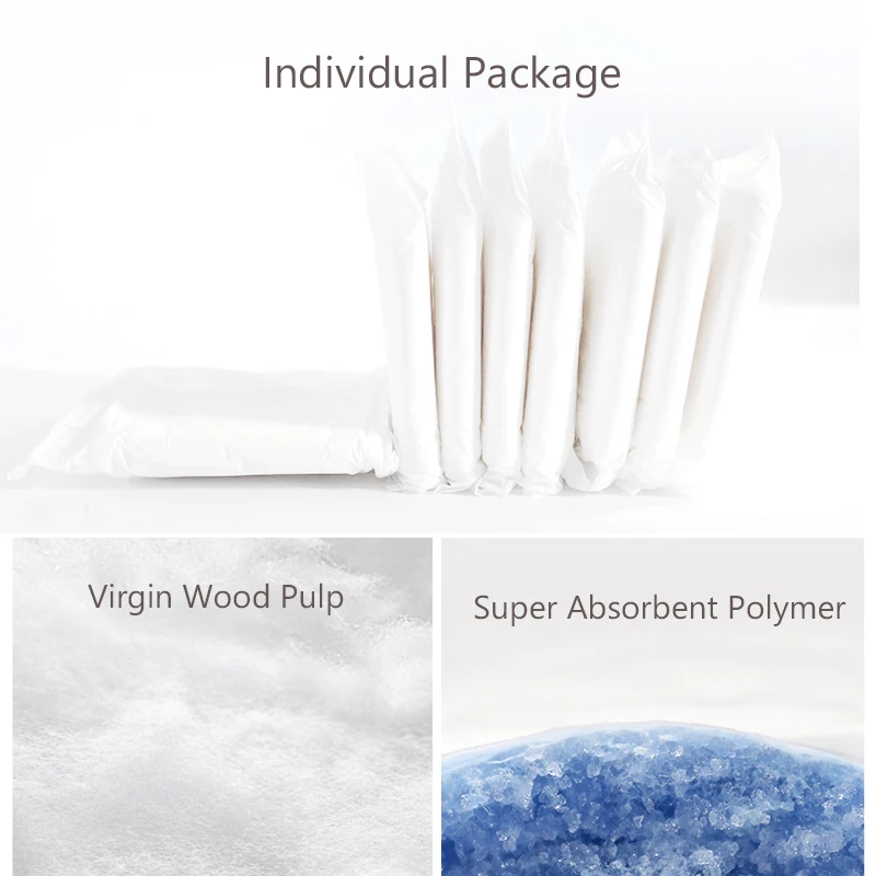 Материал изделия: водопоглощающий полимер SAP, оригинальный древесно-целлюлозный хлопок, герметичная пленка из полиэтилена