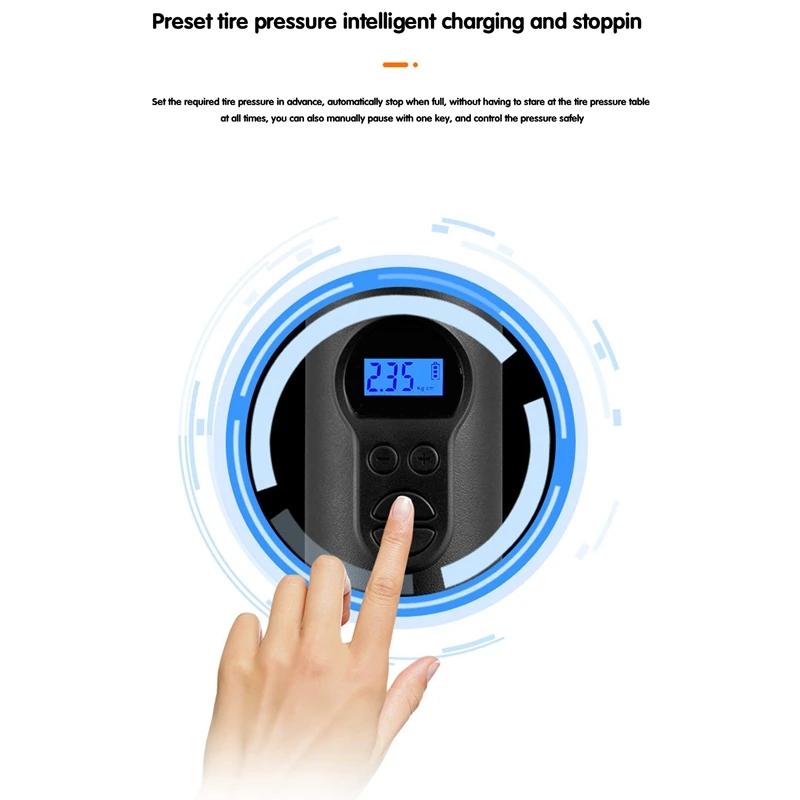 Беспроводной и портативный: беспроводной дизайн и компактный мини-размер делают воздушный компрессор портативным и простым в использовании одной рукой. Компрессор закончен всего за 4 шага. ЖК-дисплей показывает давление воздуха. Подходит для надувания, когда автомобильные шины недостаточны, а шины для велосипедов и мотоциклов полностью надуты.