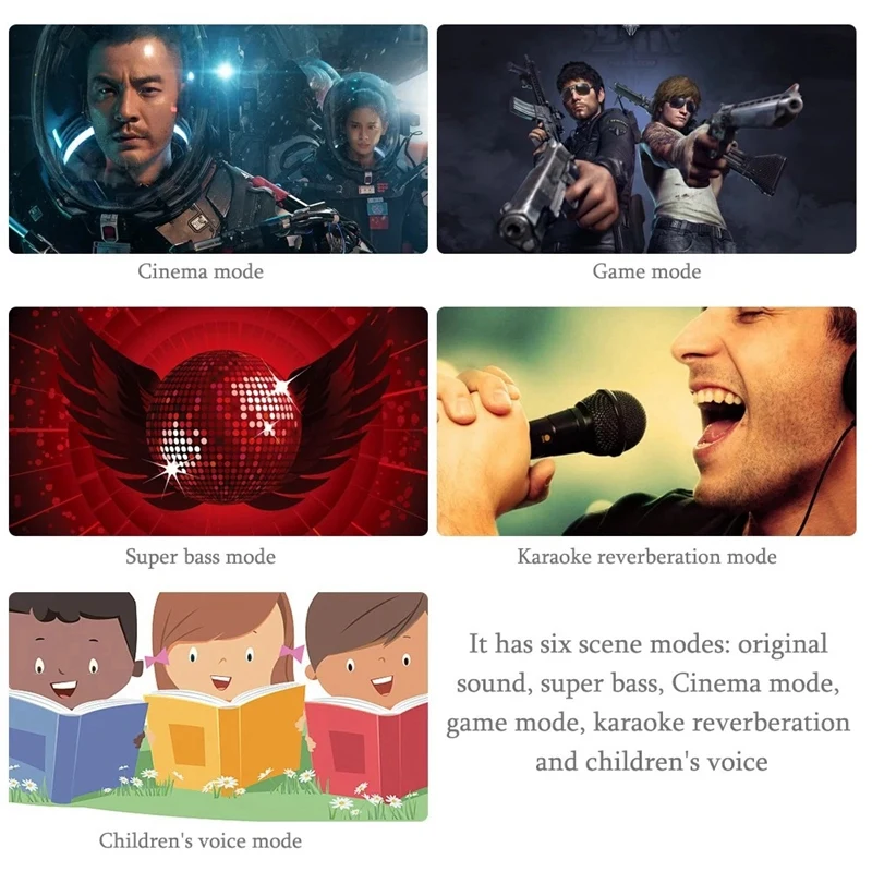 Он имеет шесть режимов сцены: оригинальный звук, супер бас, режим кинотеатра, режим игры, реверберация караоке и детский голос. Нажмите и удерживайте кнопку паузы в течение 1 секунды для переключения различных звуковых эффектов.