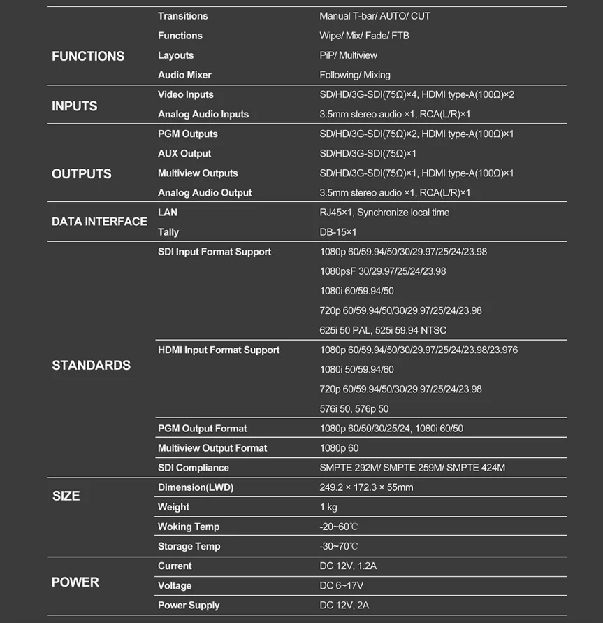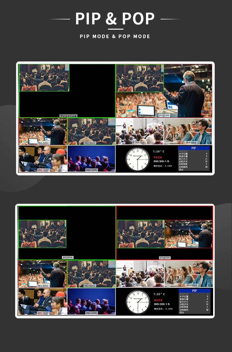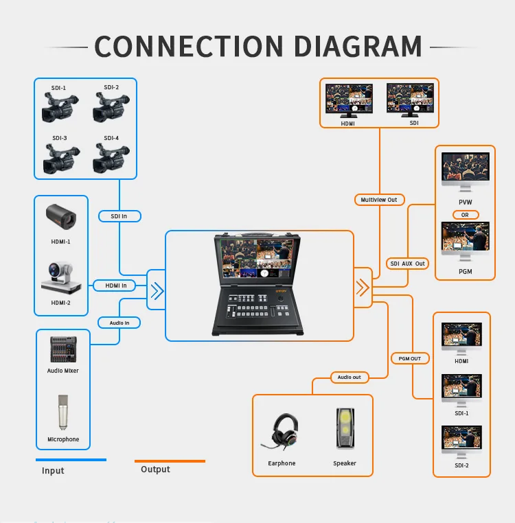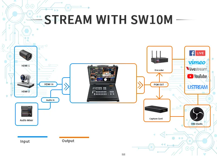 Oton Geek SW10M может переключать до 6 различных видеовходов (4xsdi + 2XHD MI) во время записи программы. Многовидовая компоновка позволяет отображать предварительный просмотр, программу и источники ввода на одном экране с функцией PIP. Это делает Geek SW10 портативной ТВ-студией, которую можно взять с собой куда угодно и настроить с минимальными усилиями или дополнительным оборудованием.